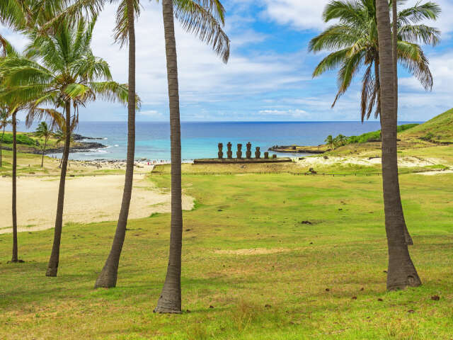 After breakfast, we will begin our full-day tour of Rapa Nui culture, exploring the powerful Moais and ending with a view of turquoise waters. We will visit multiple sites to view the Moais along the coastal road, including Rano Raraku, where many of these incredible statues were carved and some still remain, Ahu Tongariki with its 15 restored Moais, Ahu Akahanga, and Ahu Te Pito Kura, also known as the "Navel of the World." After ample viewing time of these giant marvels, we will continue to the white sand beaches of Anakena with its bright turquoise shore, palm trees, and Ahu Nau Nau. A picnic lunch will be provided during the tour at a decided-upon location. We will return to Hanga Roa via the central Island road and be back at the hotel for dinner.